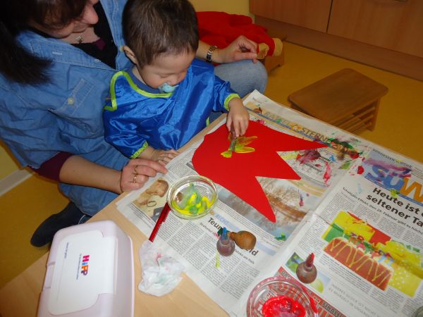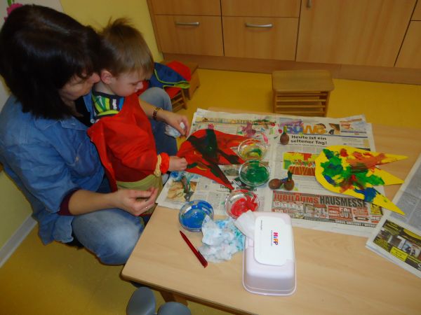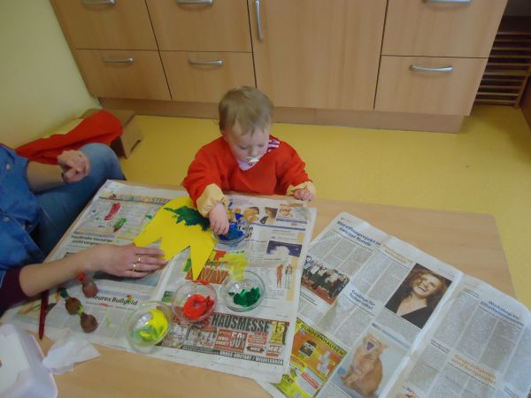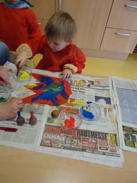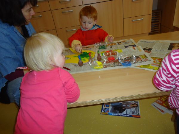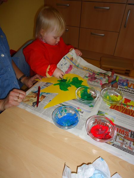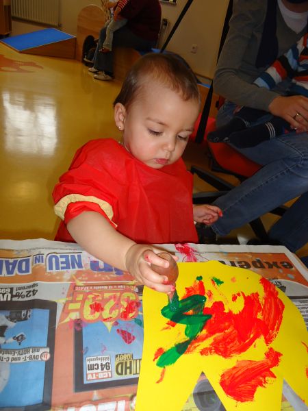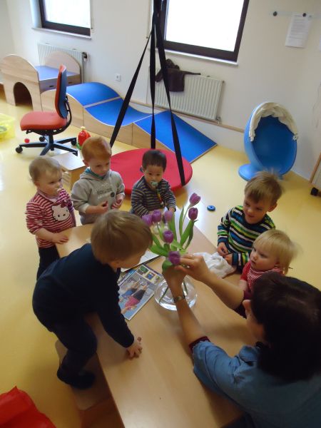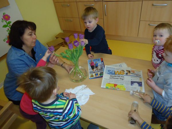 Wir haben uns einen Strauß Tulpen angeschaut und uns dann ein eigenes Tulpenblütenblatt bemalt. So, wie wir das wollten. Gestrichen, gekleckst, verschmiert, betupft.