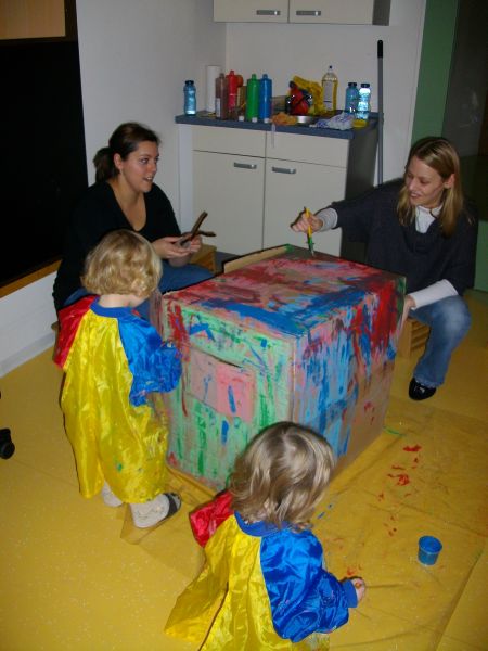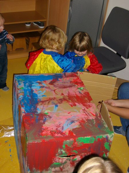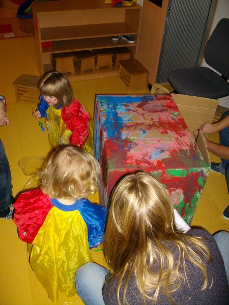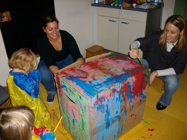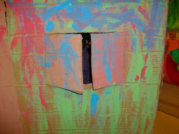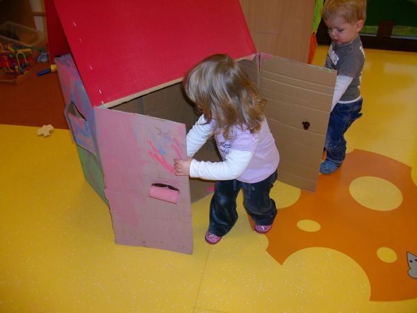 Aus einem einfachen Karton bastelten wir ein Haus für die Kinder. Die Fassade bekam einen Anstrich, das Dach wurde gedeckt und mit Hilfe der Türgriffe gelangten die Kinder einfacher in das Häuschen.