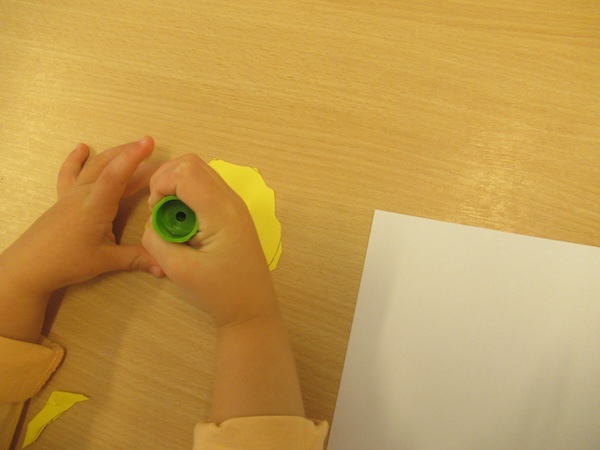 Hierfür brauchen wir gelbes und weißes Papier, Kleber, Schere, Fingerfarbe und Pinsel.