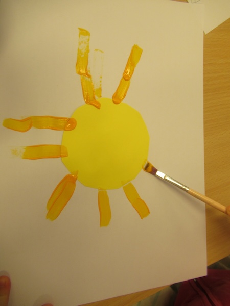 Wir schneiden einen gelben Kreis aus und kleben es auf das Papier. Dann malen mit Fingerfarbe die Sonnenstrahlen dazu. Schon ist unsere Sonne fertig und die Trollegruppe erfreut sich an den vielen Sonnen, die die Kita erhellen.