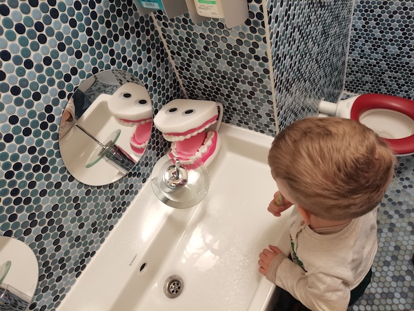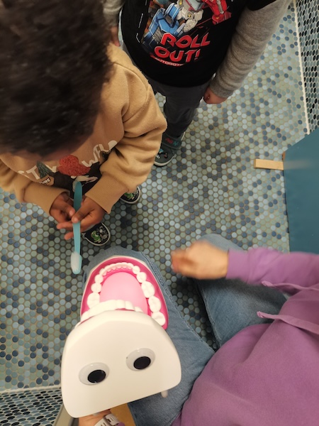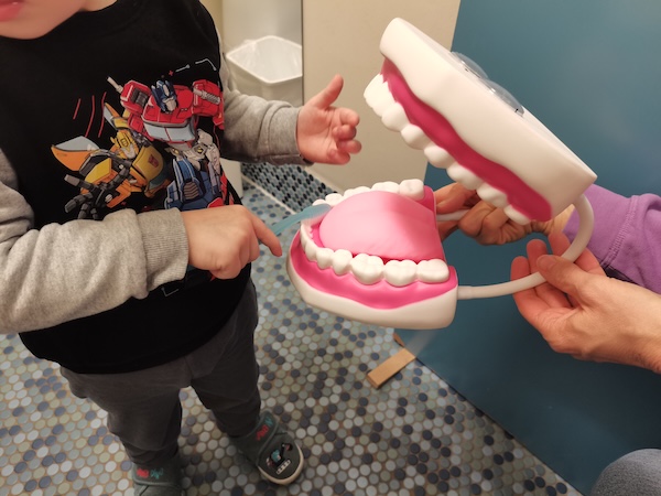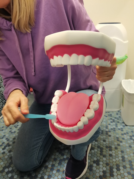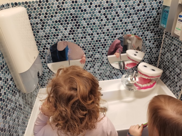 Bei den Wichteln und Zwergen üben wir das Zähneputzen nach der KAI-Methode ( Kau-flächen, Außenflächen, Innenflächen). Mit dem großen Gebiss und der Zahnbürste macht das gleich noch mehr Spaß! Dazu singen wir das Zahnputzlied und üben natürlich auch mit den eigenen Zahnbürsten.