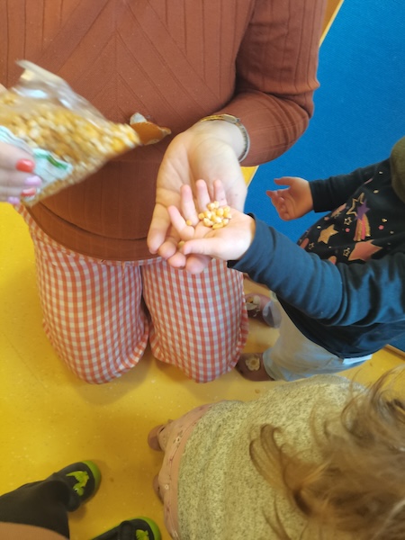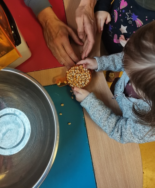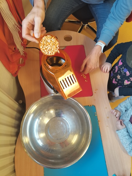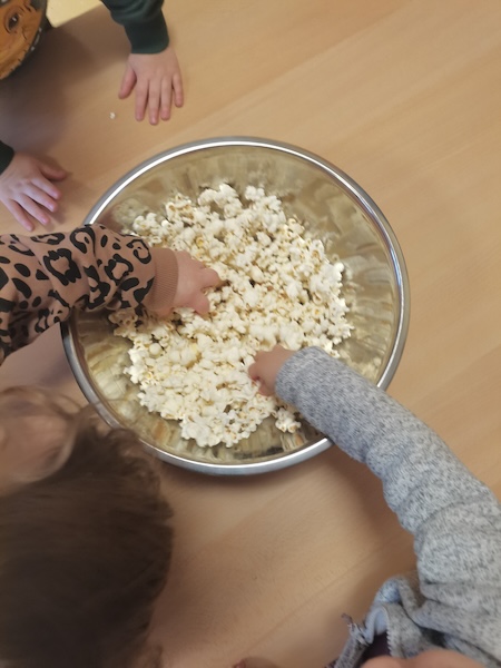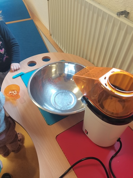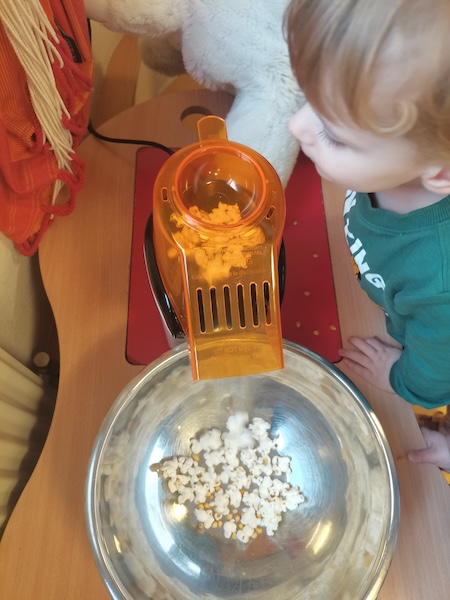 Die Zwerge- und Wichtel-Kinder waren ordentlich gespannt, was mit den kleinen Maiskörnern passieren würde — so klein, gelb und hart. Sie sahen gespannt zu, wie die Körner in einer kleine Maschine herumwirbelten, und plötzlich poppte etwas heraus. Erst ein, zwei Mal, und dann wurde es immer mehr. Aus der Maschine hüpfte Popcorn in eine Schüssel. Weg waren die kleinen Maiskörner. Die Zwerge- und Wichtel-Kinder hatten sichtbar großen Spaß beim Zuschauen und vor allem beim Essen.