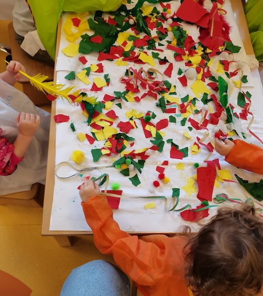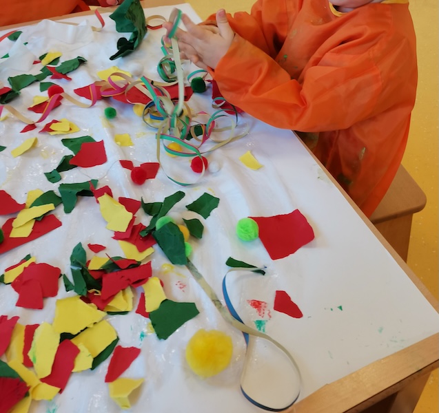 In den passenden Farben Rot, Gelb und Grün haben die Kinder erst viele Schnipsel gerissen und sie dann auf einem großen Papier aufgeklebt. Dazu kamen noch Luftschlangen und Krepppapier und fertig ist das Fastnachtsbild. Äla!!!