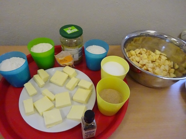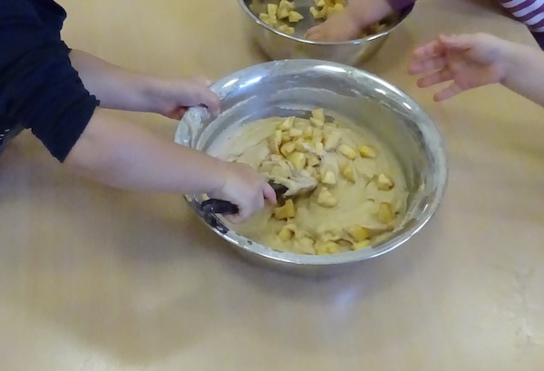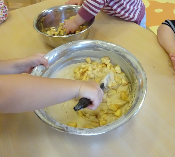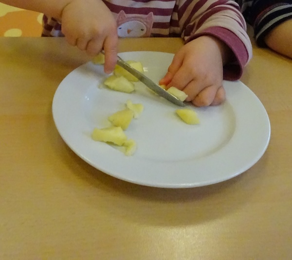 Die Kleinen Strolche backen einen Apfelkuchen. Als erstes müssen dafür Äpfel in kleine Würfel geschnitten werden. Das ist eine tolle feinmotorische Übung für die Kinder.