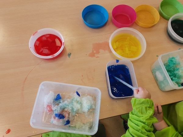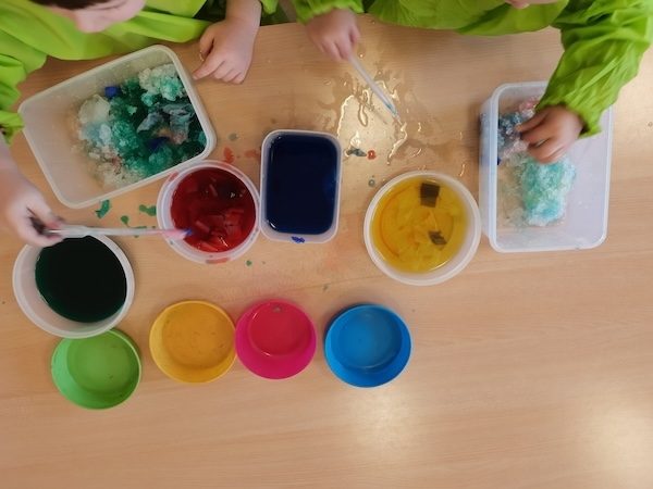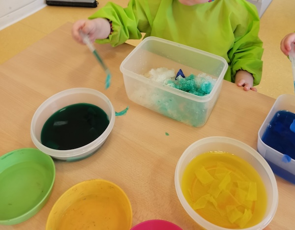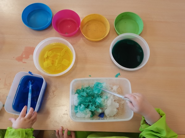 In den bunten Behältern befindet sich Krepppapier in verschiedenen Farben, mit denen die Kinder erst Wasser einfärben. Anschließend holen wir zusammen etwas Schnee aus dem Garten. Mit Pipetten färben die Kinder dann den Schnee ein und beobachten wie sich der Schnee verfärbt und die Farben sich miteinander vermischen.