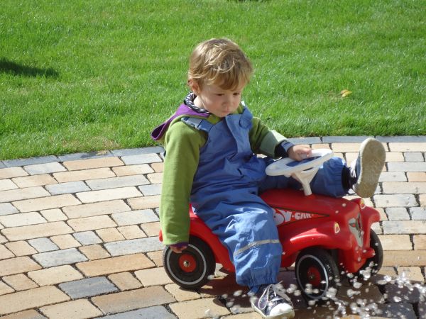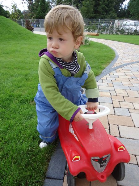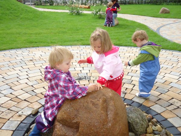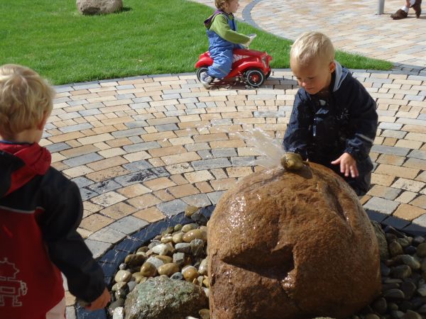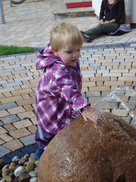 Wir haben das neue Außengelände ausgiebig genutzt, haben mit Sand gespielt, sind gerutscht, haben die Bobbycar-Rennstrecke eingeweiht und viel am Quellstein gespielt. Besonders großen Spaß macht es Steine und Hände so auf das Austrittsloch zu legen, dass eine große Fontäne entsteht.