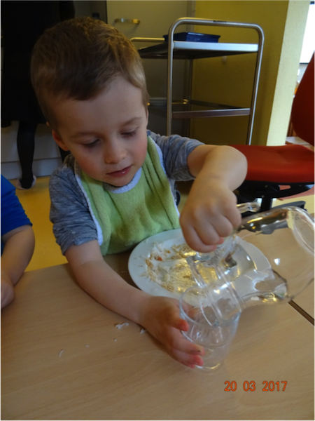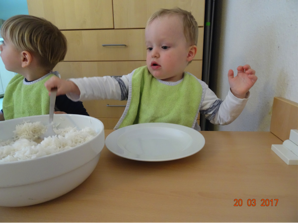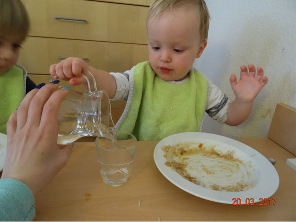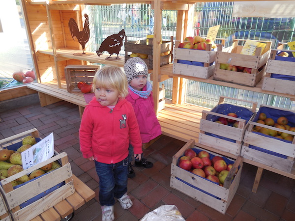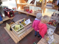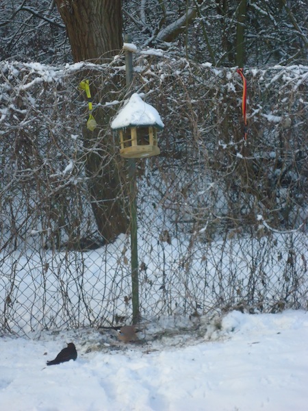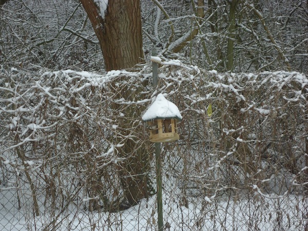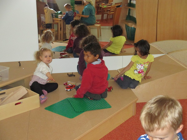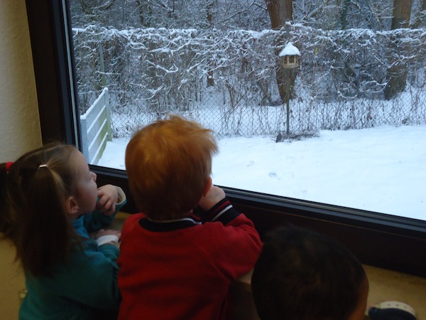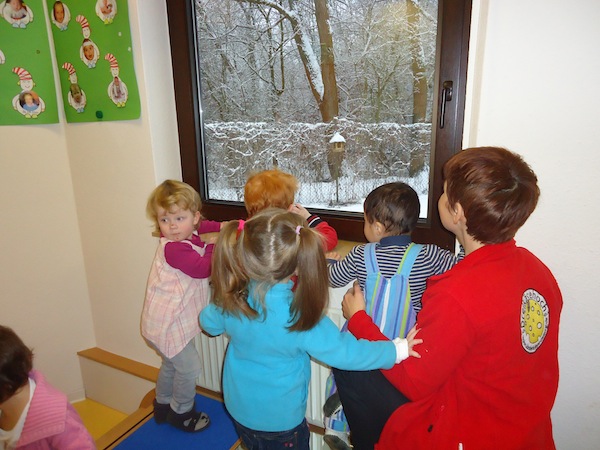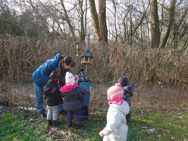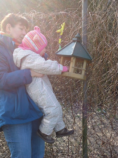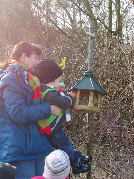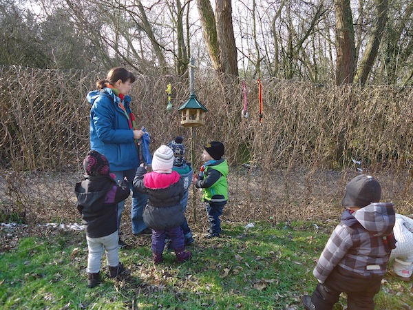 Die Kinder stehen oft auf den Podesten und schauen mit uns zum Fenster hinaus. Viele verschiedene Situationen sind dabei zu beobachten und so kam es, dass die Kinder uns immer wieder auf die vielen verschiedenen Vögel vor unserem Fenster aufmerksam machten. So kam bei uns die Idee auf, eine Vogelbeobachtungsstation einzurichten. Wir besorgten ein Vogelhaus und kauften Vogelfutter und sofort kamen viele Vögel an unsere Station. Wir besorgten zudem noch ein Vogelposter, ein Bestimmungsbuch, singen seitdem Vogellieder mit den Kindern und schon nach ein paar Wochen kannten die Kinder Vogelnamen, wie z.B. Blaumeise, Kohlmeise, Sperling, Eichelhäher , Kleiber usw.