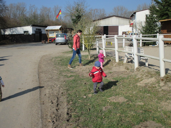 Die Wichtel und Zwerge nutzten das schöne Wetter und waren viel an der frischen Luft. Die Kinder freuten sich auf die ersten Sonnenstrahlen und die warmen Temperaturen. So macht das Spielen im Sand, das Rutschen oder Spazieren gehen, erst richtig Spaß. Die Kinder wollten bei dem Sonnenschein nach den Pferden sehen und schauen, wie sie auf der Weide stehen. Vielleicht findet ja auch wieder eine Reitstunde statt?Die Wichtel und Zwerge haben schon öfter Reiter beobachtet die auf dem hohen Pferd sitzen und vorbei reiten. Es faszinierte die Kinder und sie haben eine Menge Fragen: