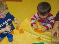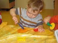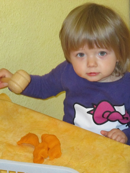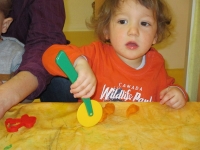 Die Kinder schneiden die Knete, hämmern auf ihr herum. Es wird alles ausprobiert. Den Kindern bereitet es große Freude mit dieser formbaren, weichen Masse zu spielen. Sie befüllen den Bagger und LKW und spielen so die Geschehnisse auf dem Außengelände nach. Sie zeigen stolz den Erzieherinnen ihre Werke und sprechen darüber. Das Kneten macht all unseren Kindern großen Spaß und alle kommen gerne an den Knettisch und machen mit