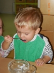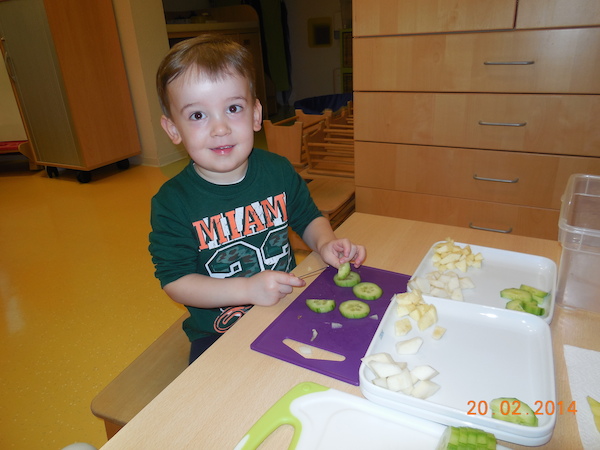 Immer wieder üben sie z.B., wie man sich die Schuhe an und aus zieht, Zähne putzt, wie man sein Brot bestreicht, sich Wasser einschenkt, selbstständig eine Treppe hoch und runter läuft und noch vieles mehr.