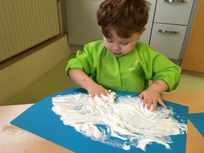 Dazu mischten die Kinder Bastelleim mit Rasierschaum und fertig war der „fluffige Schnee-Kleber“.